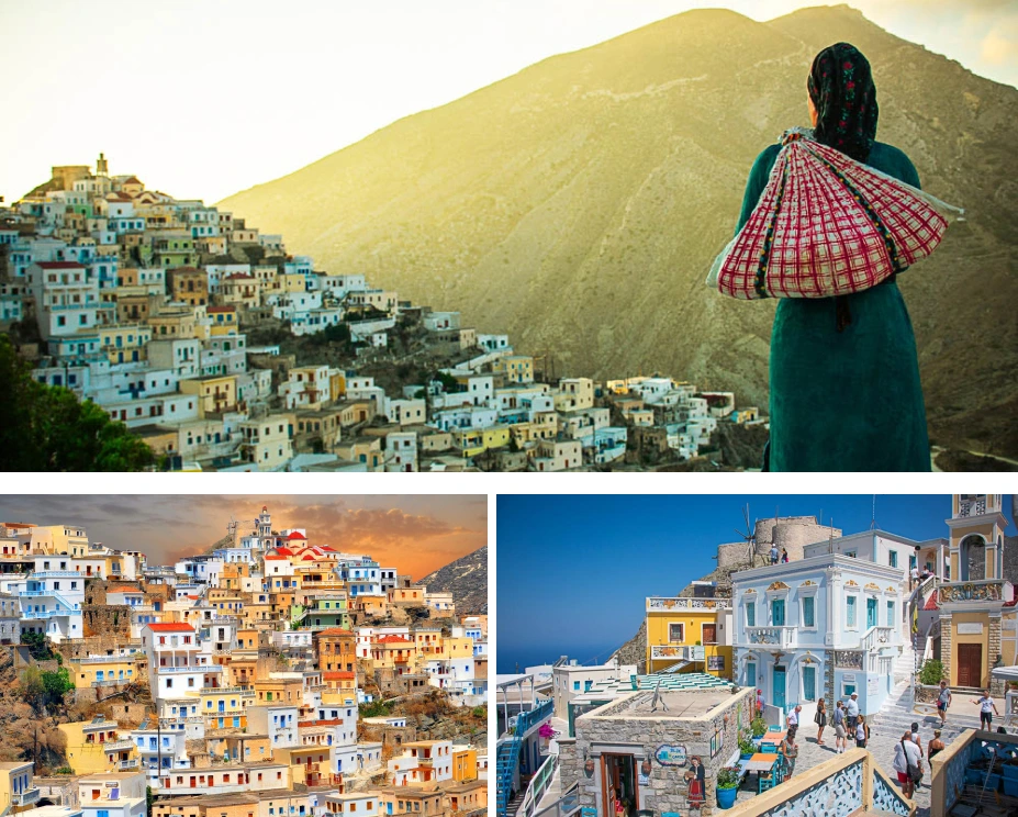 Olympos is one of the twelve villages on the island, where time seems to has stopped. It is set high in the mountains of Karpathos, especially known for its traditional standing. There, you will meet women who dress in the traditional Karpathian attire, which is unique to this village, passed down from their ancestors. They take their traditions very seriously which brings an incredibly authentic feel to the town. You may eat at small family taverns, walk through the colorful streets of Olympos and embrace the true Greek village life. You will definitely need to wear your sneakers and even bring a light jacket as it gets cold this high up! Some visitors combine their trip to Olympos with a visit to Diafani village,